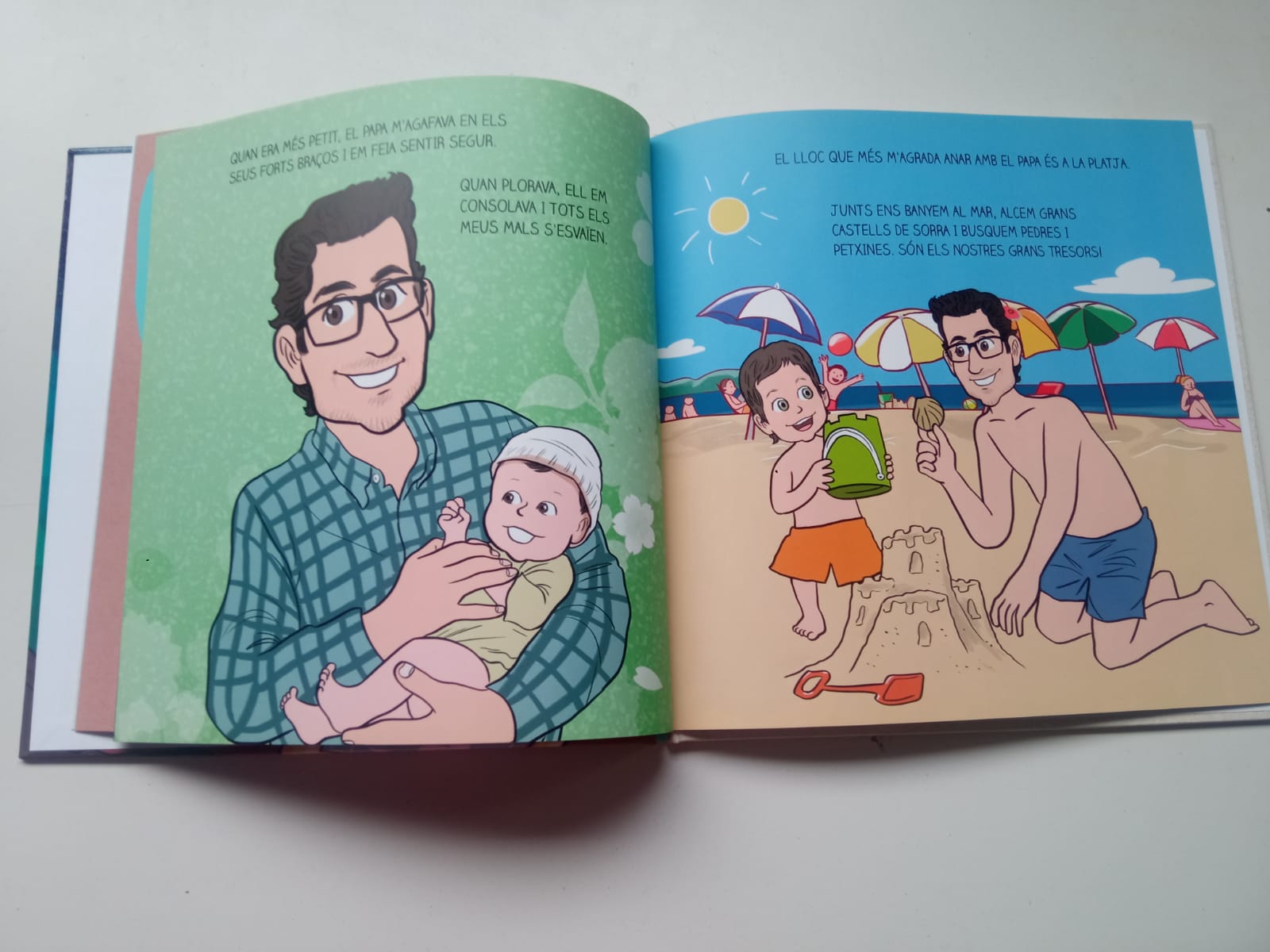 Així doncs, com a regal súper xulo, súper creat al 100% a partir de les vostres fotos dels protagonistes i el text informatiu que passeu, nosaltres dibuixarem al pare de forma que el reconeixereu, a partir de les fotos que ens hagueu passat i també us dibuixarem a vosaltres i als fills i les filles, també a partir de les fotos que ens passeu! Per tant, el nostre conte personalitzat pel dia del pare, el millor pare del món, és el conte personalitzat que val més la pena dels que ofereixen altres empreses de contes personalitzats. Tota la resta d’empreses de contes personalitzats, no dibuixen el dibuix dels protagonistes a partir de les fotos enviades, sinó que sou vosaltres els que heu de triar com té la cara, els cabells, la boca, etc…Tot està processat a través de les plantilles, cosa que en aquests contes personalitzats els hi treu tota la màgia i fa que estiguin repetits els uns amb els altres. En canvi, el nostre conte personalitzat el millor pare del món, és un conte personalitzat que ningú més tindrà, només la vostra parella, el pare dels vostres fills i filles.
